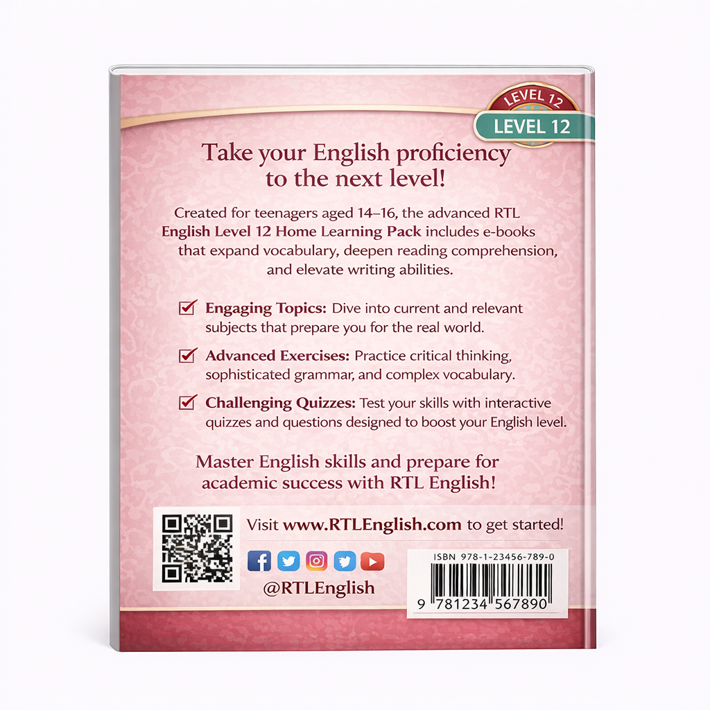 Help teenagers build strong English skills with the RTLEnglish Level 12 Home Learning Pack, specially designed for students aged 14–16 years. This advanced learning pack includes carefully structured e-books that improve reading, writing, grammar, and vocabulary through engaging lessons and real-world topics.