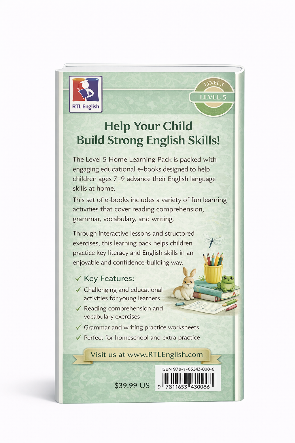 This digital learning pack includes a collection of educational e-books that focus on improving reading comprehension, vocabulary, grammar, spelling, and writing abilities. The lessons are designed to support children as they continue building confidence in English through fun and interactive exercises.